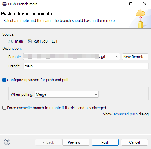 따로 설정 건드리지 않고 Push를 눌러주면 된다.