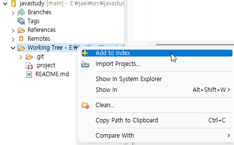 Git Repositories 우클릭 ➡️ Add to index를 하면 Git Staging의 Staged Changes에 파일이 추가된다.