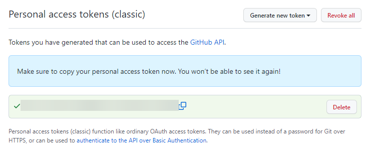 주의할 점은, 토큰은 딱 한 번만 확인할 수 있기 때문에 생성 후에 바로 메모장에 복사해두어야 한다.