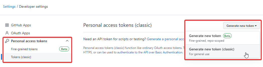 Personal access tokens ➡️ Tokens(classic) ➡️ Generate new token(classic) 클릭