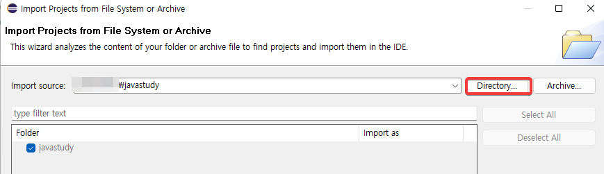 창이 뜨면 Import source에 아까 복사한 javastudy 폴더(설정한 디렉토리)를 선택해 준다.